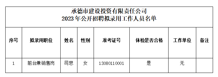 根據2023年度承德市建設投資有限責任公司公開招聘工作人員的相關要求,經過筆試、面試、體檢和考察等程序,確定司思同志為承德市建設投資有限責任公司擬錄用工作人員,現(xiàn)予以公示。公示期間如有異議,可通過電話、信函等方式反映,反映意見請署真實姓名。